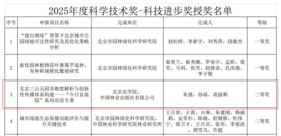 牵头完成、中国林业出版社有限公司出版发行的“北京三山五园多维度解析与创新性传播体系构建——‘今日宜逛园’系列双语专著”项目凭借突出的学术创新、显著的应用成效,荣获科技进步奖二等奖。这一荣誉既是对项目团队在园林文化研究与传播领域辛勤付出的肯定,也是破处视频